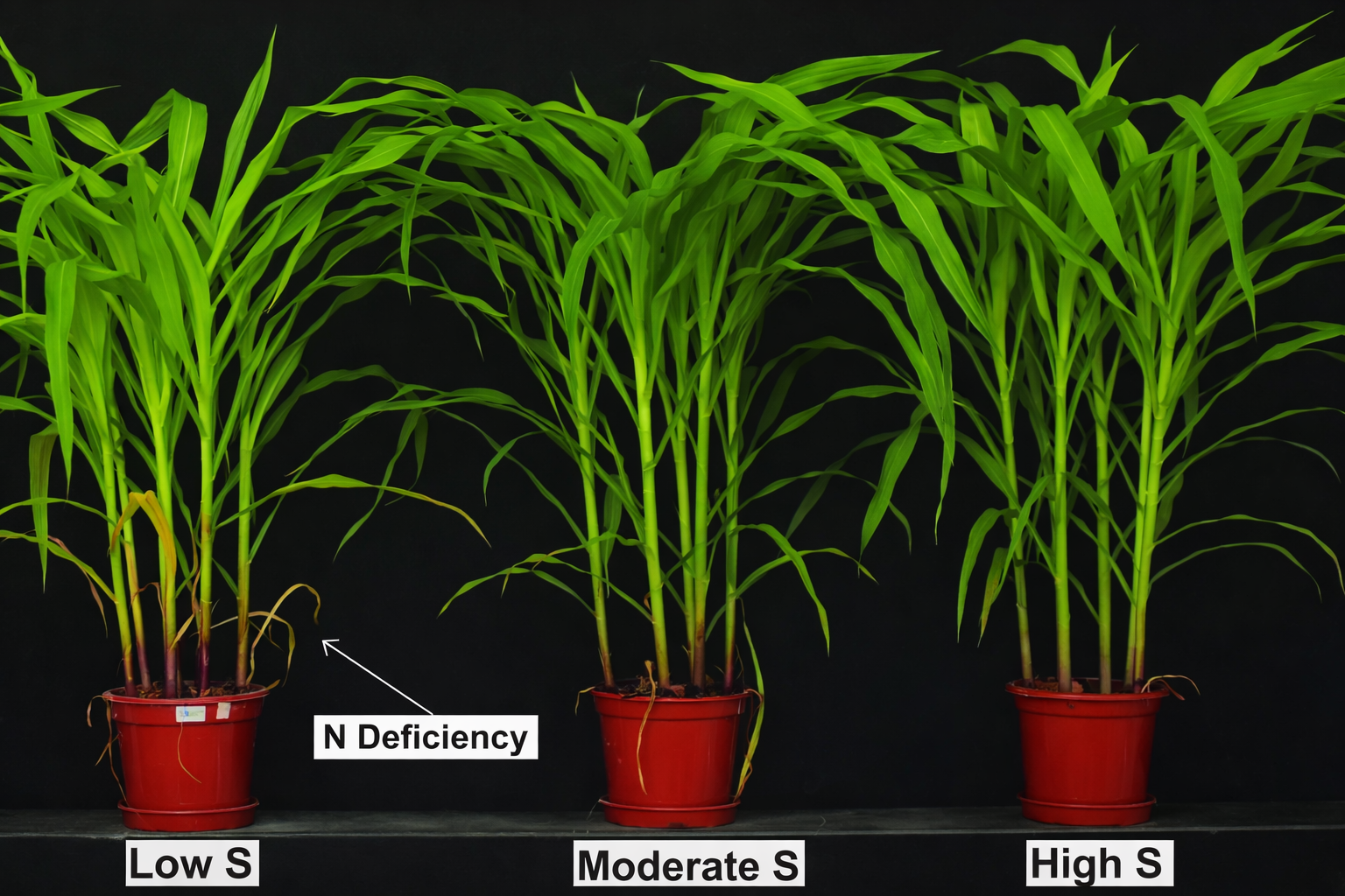 Figure 4: Even when nitrogen is supplied at a sufficient rate, plants that lack sulfur can show N deficiencies compared to plants that have adequate or high S supplied to the soil7.
