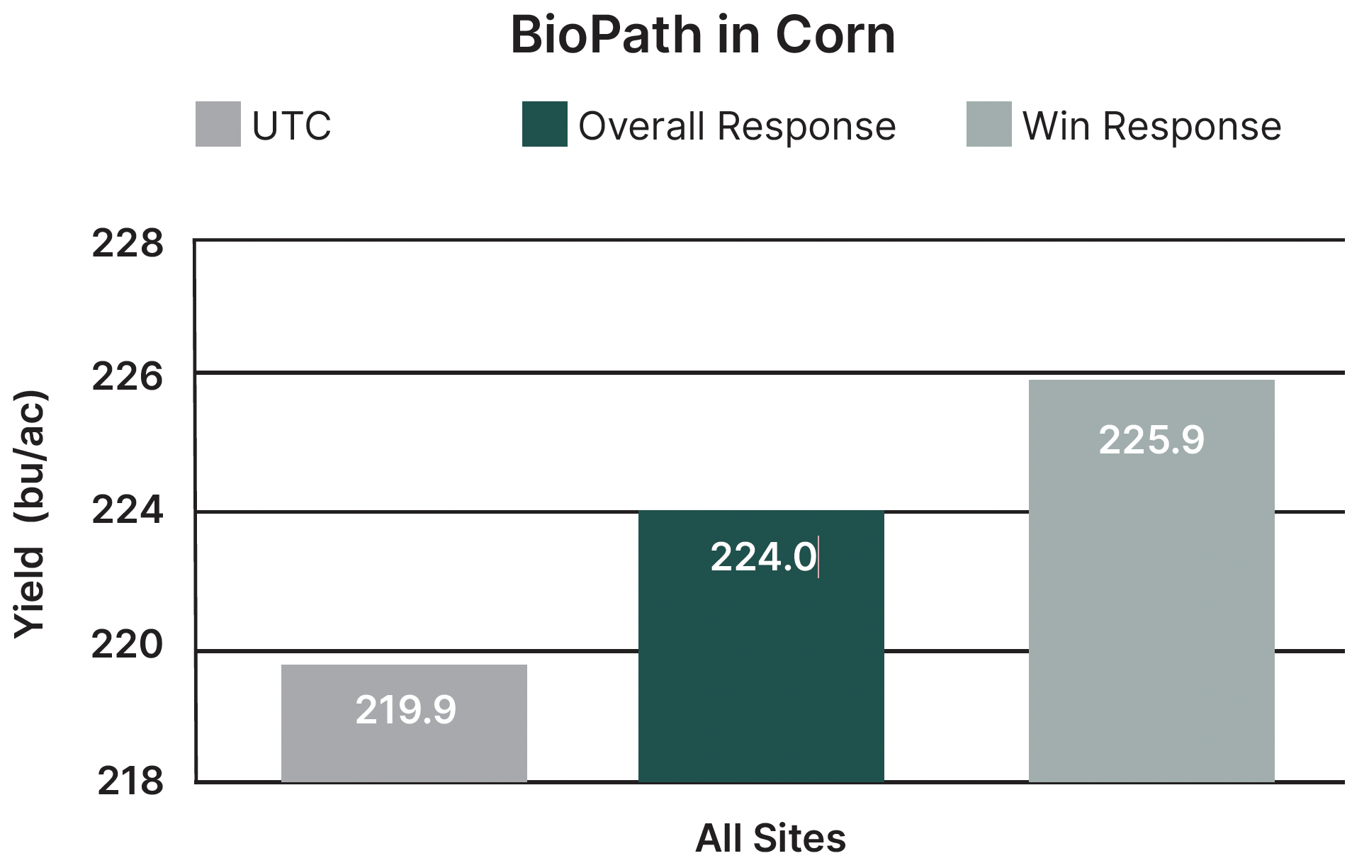 Comparisons between BioPath and untreated checks resulted in a +4.1 bu/ac yield increase from BioPath in 78% of comparisons.