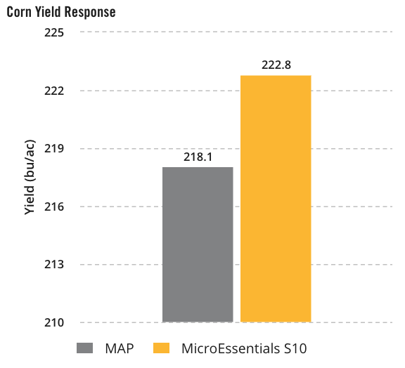 MicroEssentials® S10® increased corn yield by 4.7 bu/ac over MAP across 47 trials in 17 states/provinces.